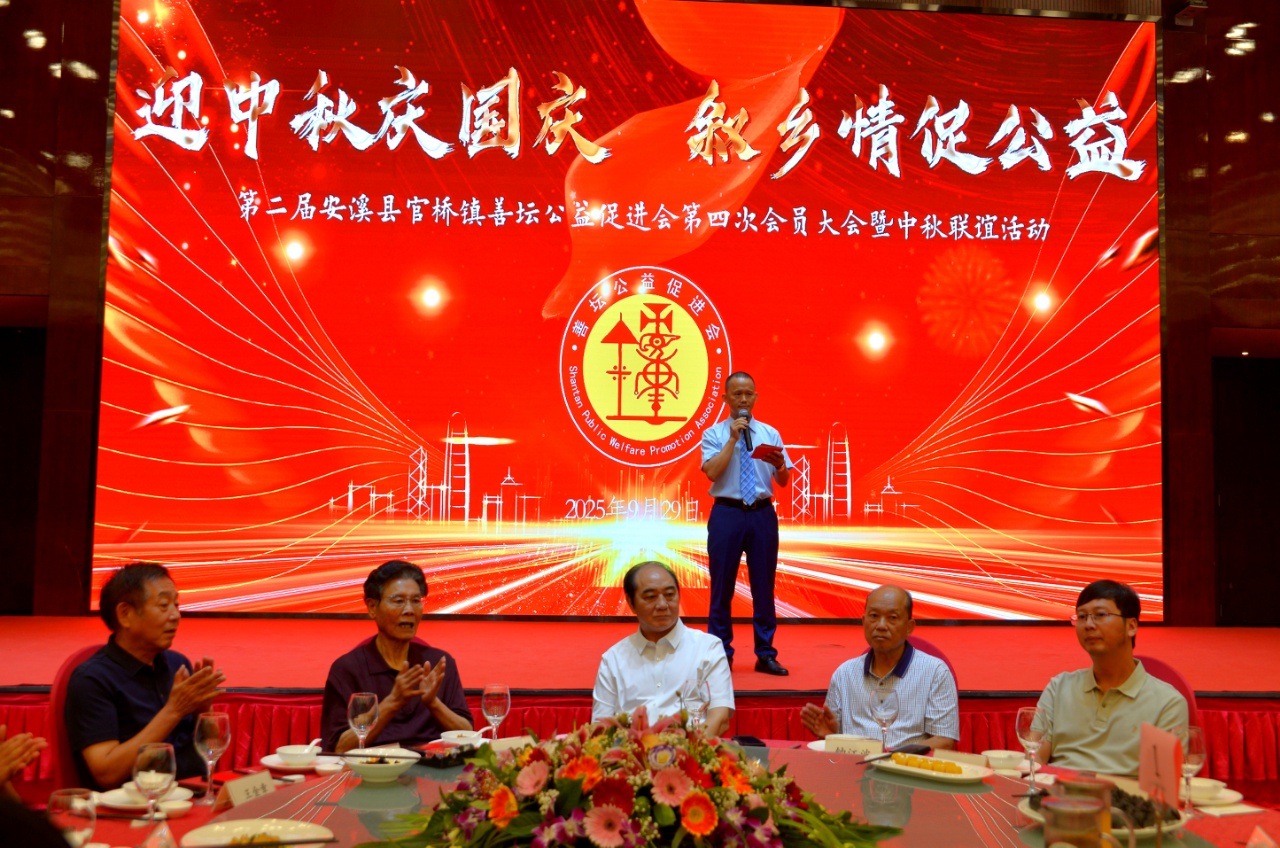 会长致辞:中秋节是团圆的节日,是丰收的节日,也是感恩的节日。今夜,我们虽然身处他乡,但我们的心与故乡紧密相连。今晚,让我们共同品尝美食美酒,共同享受团圆的喜悦,也共同感受由血脉和乡情编织的温暖。安溪县官桥镇善坛村公益促进会成立9年来,积极为厦门和善坛村的发展架起一座合作的桥梁,努力促成在厦善坛宗亲们的互动互联、互帮互助、共同进步,致力于让每位在厦宗亲感受到大家庭的关爱与温暖。在过去的一年里,我们先后组织了高考助学奖学、环善坛公益跑等活动,实实在在为父老乡亲办了一些事。