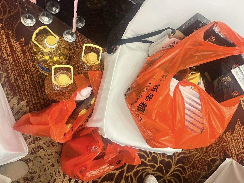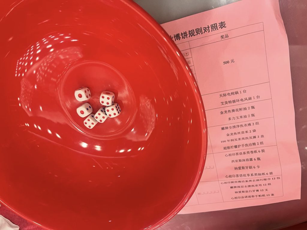 活动奖品清单,虽然都是些生活用品,但是实用,图中骰子开出来的就是状元插金花,四个四,两个一,天牌的存在。