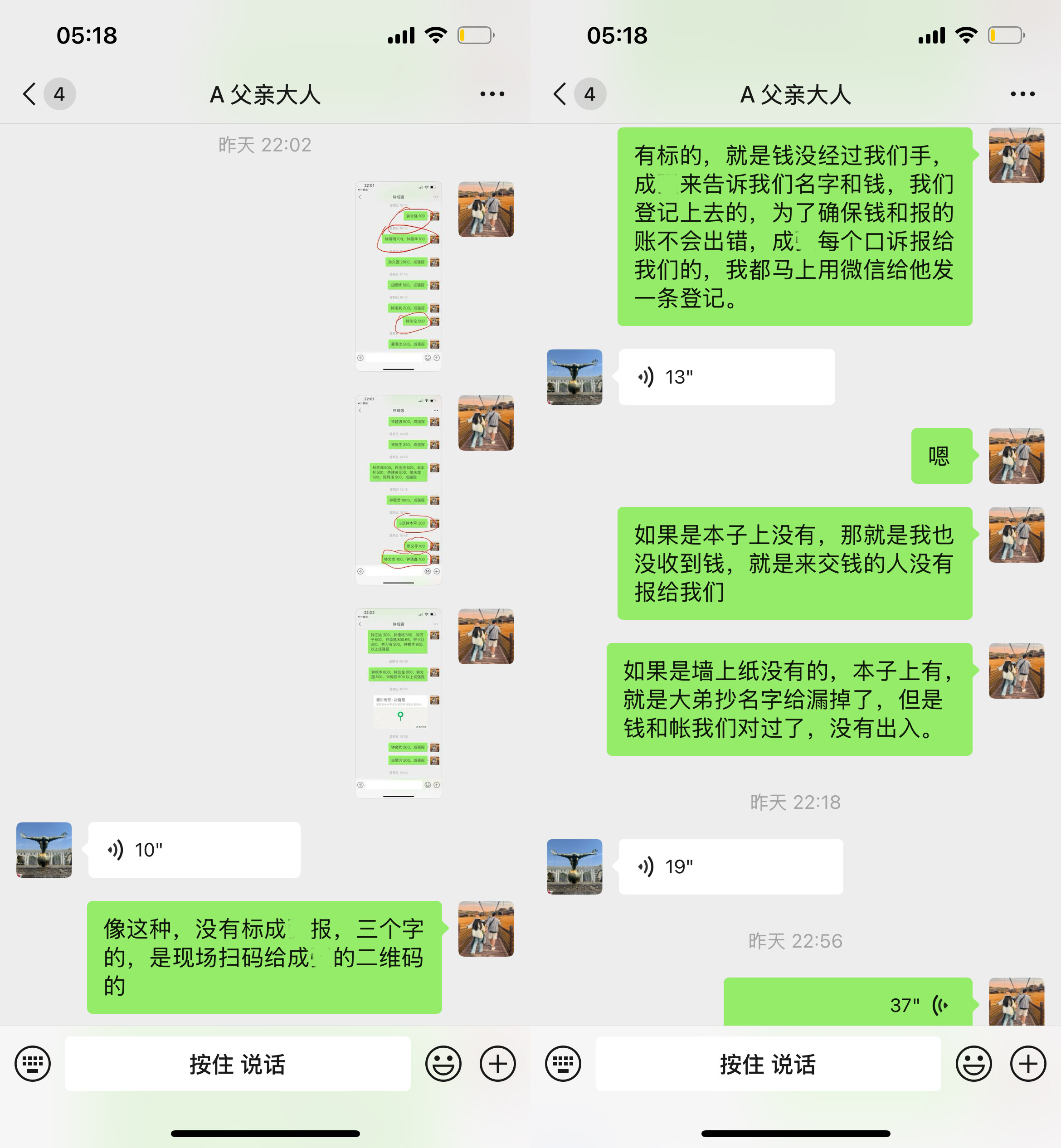 绝大部分的人随份子都是现金装红包,但是也有部分人是扫码发红包,我找主人家要了个收款二维码,每次遇到扫码付款的话,我就给新郎的父亲微信发一下名字金额信息报账,一开始还算顺利,但是一会儿新郎的父亲突然坐到我的身边说他那边挺多朋友直接微信给他转账,然后他就在那边念名字和金额,我脑壳嗡嗡的,这样我等下怎么统计和核对我的收支呢?好吧,用最蠢的方法,就是他坐在那边回忆谁谁谁给他转账,告诉我,我就用微信再编辑一下信息发给他,然后我按照我微信聊天记录的内容一条一条的写入《人情簿》,同时堂弟负责写请柬帖子,这总不至于出错吧。