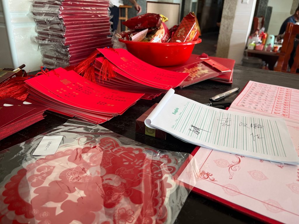 妇女们比较辛苦,需要煮点心给来帮忙的人吃,要煮四餐大锅饭,来帮忙的人应该有三十几个吧,里面包括妇女们,妇女们从一大早就在厨房切菜做饭,热火朝天的。汉子们相对而言只有三个岗位会比较累人,第一泡茶、第二写帖、第三收账, 也不是说体力劳动辛苦,这三个岗位需要从早上8点待到晚上8点,因为中途会有亲朋来贺礼,流程就是进门先到泡茶区喝一杯喜茶,然后走过来登记写贴,最后给红包记账,收了钱,给递一下喜烟和喜糖。