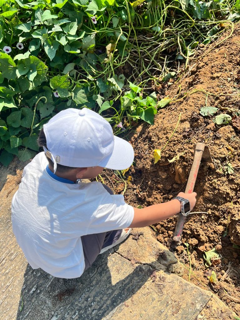 太阳很晒,娃儿回家挖地瓜,挺好玩的,他也很喜欢玩。