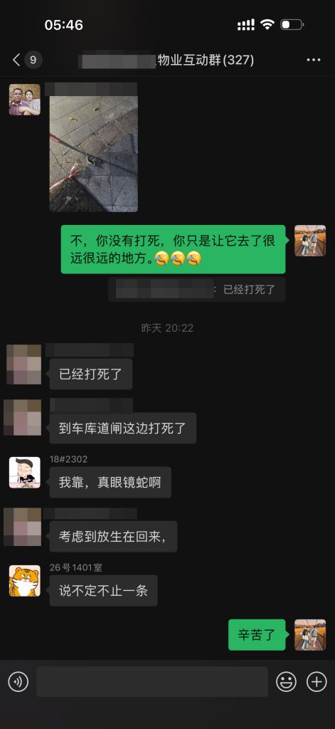 物业主任效率还不能,没一会就抓到蛇了,他在群里面说打死了,呃,我好心给他圆了下说辞,他愣是没听懂我的意思。