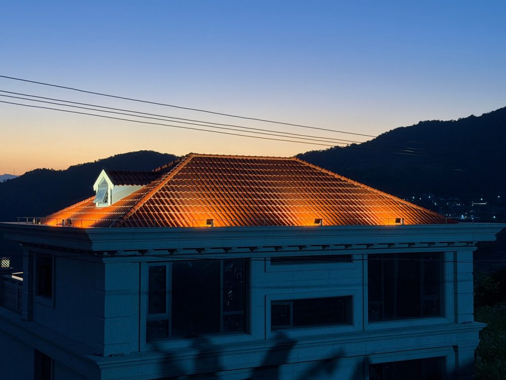 小时候最喜欢上房揭瓦,捉迷藏的时候,爬到屋顶躲着,我让你慢慢找。没错,此图,照亮坡屋顶的泛光灯,我自己一盏一盏装的,效果不是很满意,我买的泛光灯已经是角度110°的了,没有选洗墙灯,选错了,但是装上去了,就这样吧。有暗角,远处看其实也还好,暗角还挺有层次感的,就是近看光斑不太舒服,好吧,人生不能什么都追求极致完美,留一点空间,给下一次体验。