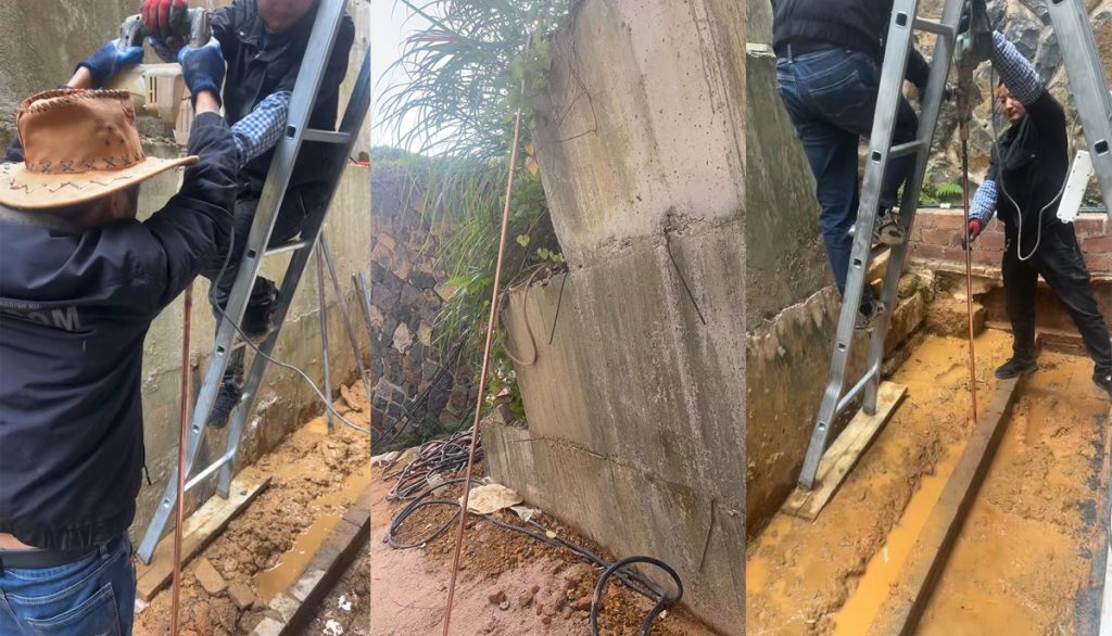 但是我总觉得还可以再降低一些,所以一开始我就在柱子边预留了一根镀锌角铁,可以延长加强防雷系统,找别人借来了接地电阻测量仪,放了几十米的线,打了几个接地点,自己摇出来的结果是8Ω,和初始摇表结果7Ω有所偏差,我感觉原因应该是土质的含水量变化,初始监测的时候是夏天,雨水充足,地下的突然水分较高,所以接地效果好,现在是冬天,许久未曾下雨,所以接地效果差了一些。那不行,我得再加强加强,买了4根6米长的铜包钢接地极,一字网延伸加长,恶狠狠的往地底下干下去,打到第三根的时候,接地电阻顺利降到了1Ω,那就相当Nice了。