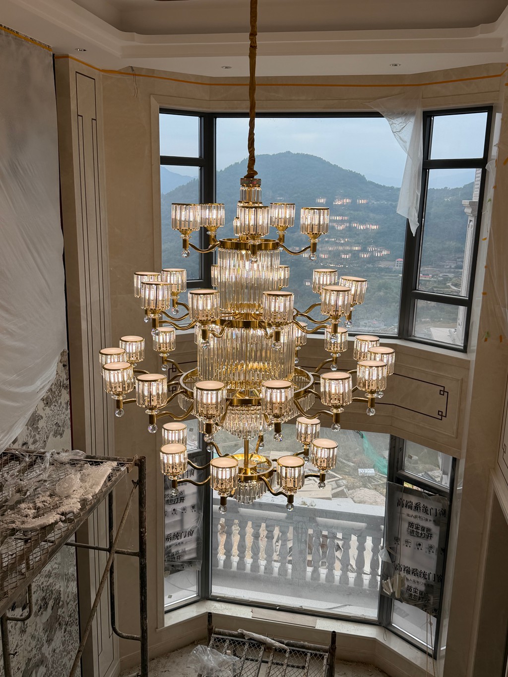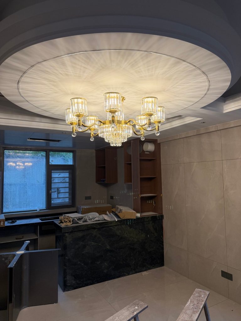 还可以吧,嘿嘿,一次完美的体验,选品没有翻车,公区都有做回字形吊顶,所以每个区域都有一盏6头的吊灯,餐厅和茶厅用的8头水晶灯,门厅用的2盏6头,客厅这个38头,总的花费30000左右,师傅安装费,6头的120元,8头的160元,38头的520元,装了四天才装完。这些灯都挺有性价比的,如果选的新中式,单客厅这盏吊灯全铜加玉石就要85000,呃,省钱省钱。