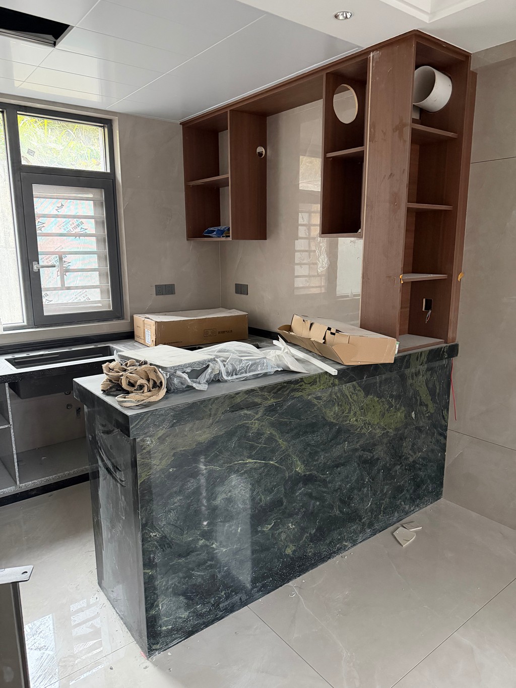 媳妇大人喜欢的奢石岛台,我给她完美搞定了,用的是她喜欢的莫奈花园,和餐桌同一块料子,这样厨房就和餐厅互相呼应了,我做的开放式厨房,得这样稍微用吧台做一点隔断,柜门还在定制中,下周就可以装上,目前石材表面都是灰尘,等完工后保洁一擦洗,肯定Beautiful。